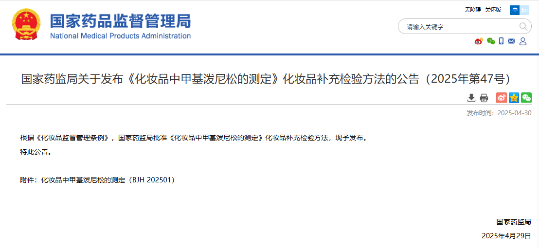 国家药监局关于发布《化妆品中甲基泼尼松的测定》化妆品补充检验方法的公告(2025年第47号)