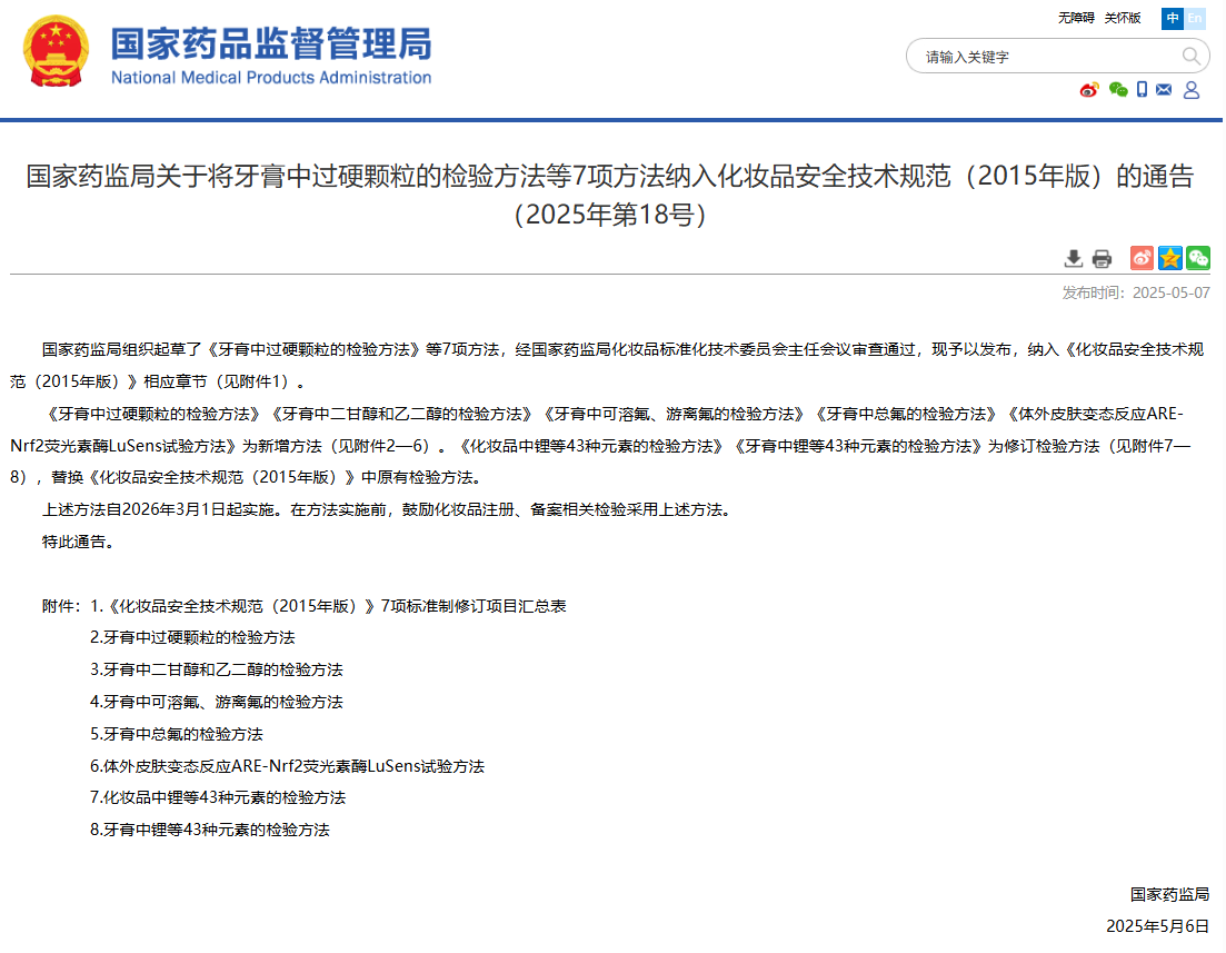 国家药监局关于将牙膏中过硬颗粒的检验方法等7项方法纳入化妆品安全技术规范(2015年版)的通告(2025年第18号)