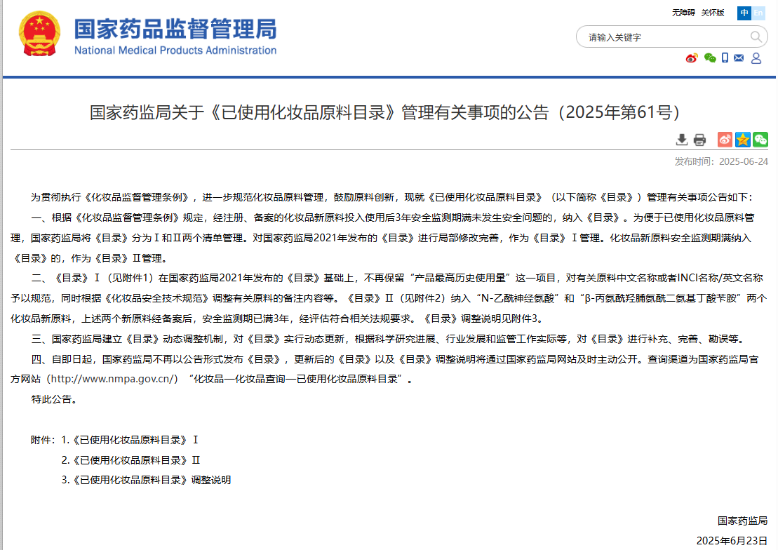国家药监局关于《已使用化妆品原料目录》管理有关事项的公告(2025年第61号)
