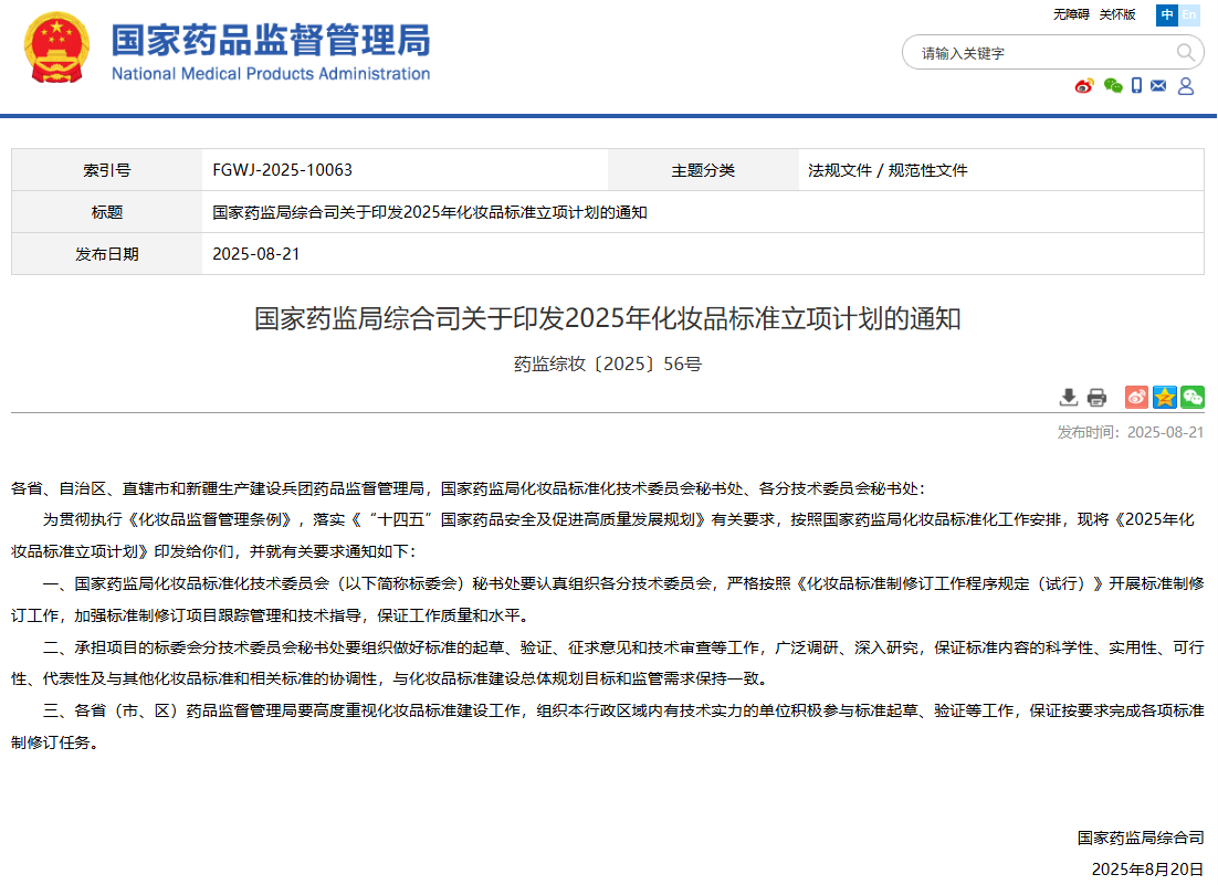 国家药监局综合司关于印发2025年化妆品标准立项计划的通知