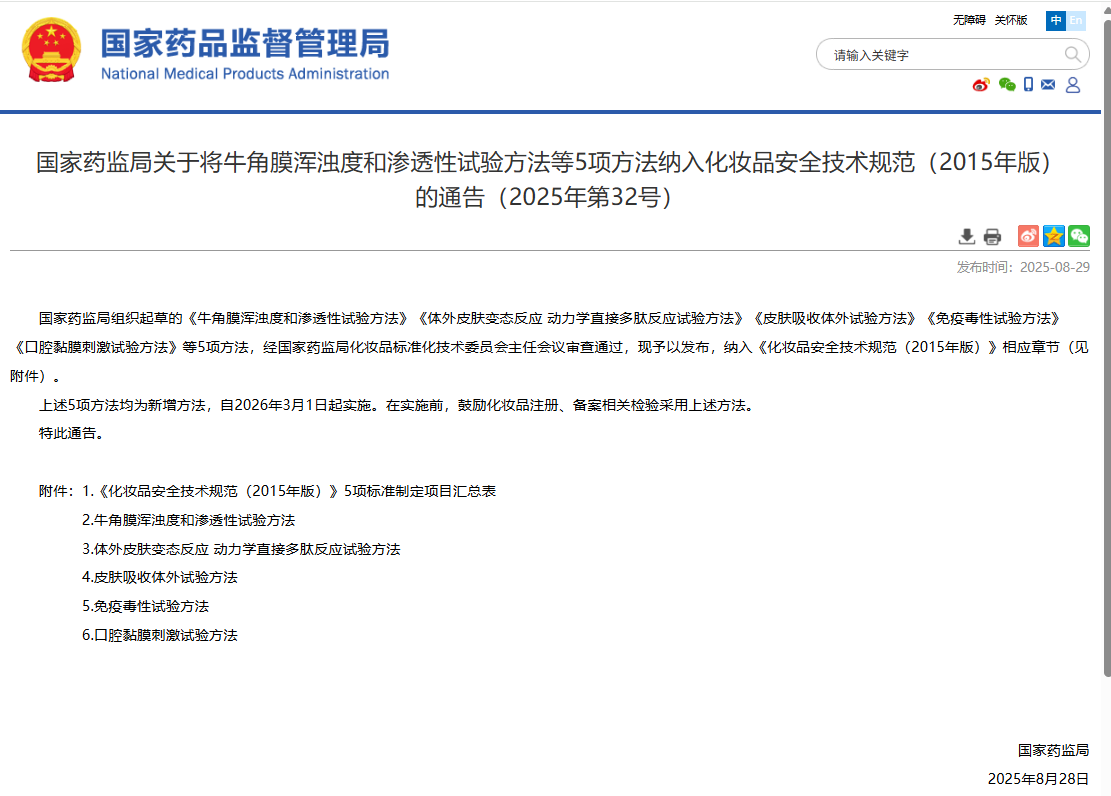 国家药监局关于将牛角膜浑浊度和渗透性试验方法等5项方法纳入化妆品安全技术规范(2015年版) 的通告(2025年第32号)