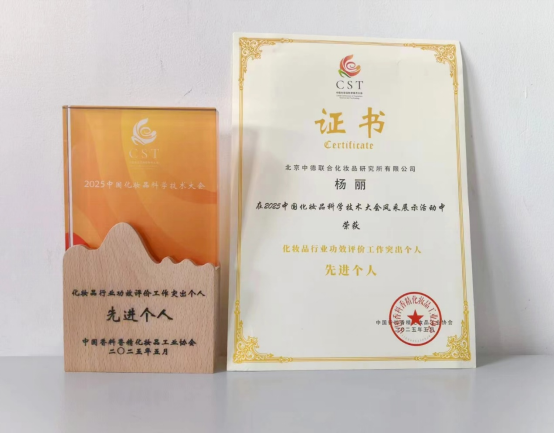 近日,我中心高级工程师杨丽被中国香料香精化妆品工业协会(简称“香妆协会”)授予“2025中国化妆品科学技术大会化妆品行业功效评价工作突出个人——先进个人”称号。 该奖项旨在表彰在化妆品功效评价、安全评估、包装设计等领域作出突出贡献的行业人才,杨丽的获奖是对其卓越专业能力和突出贡献的充分肯定。